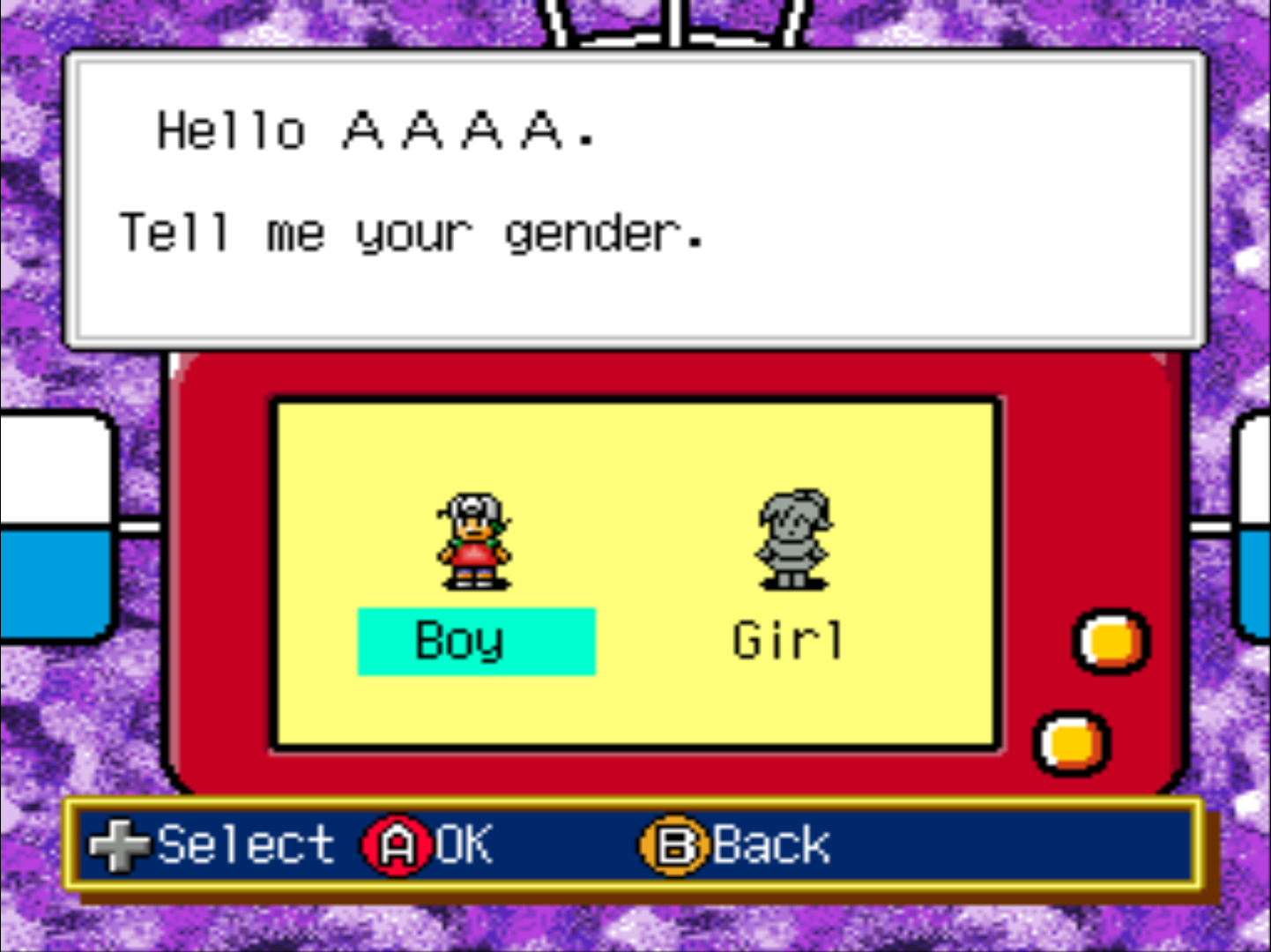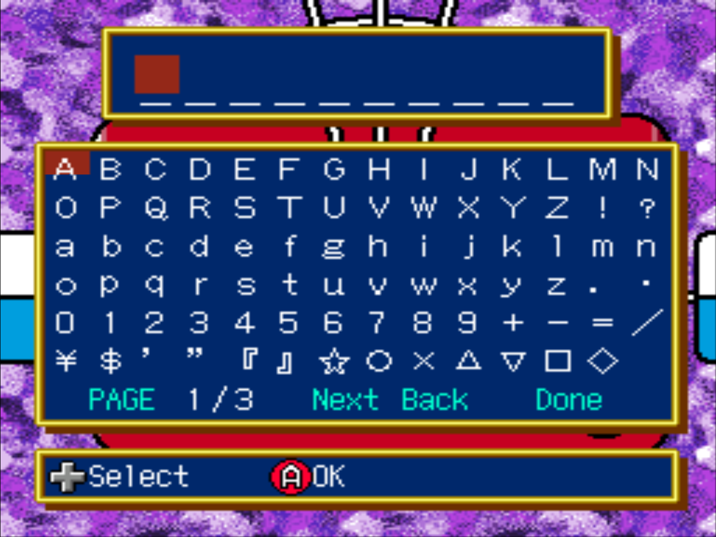 PAGE to change the alphabet. When you're done, press DONE at the bottom right (pressing the START button will put you on DONE). You will be asked whether you prefer a boy or a girl and then press DONE.