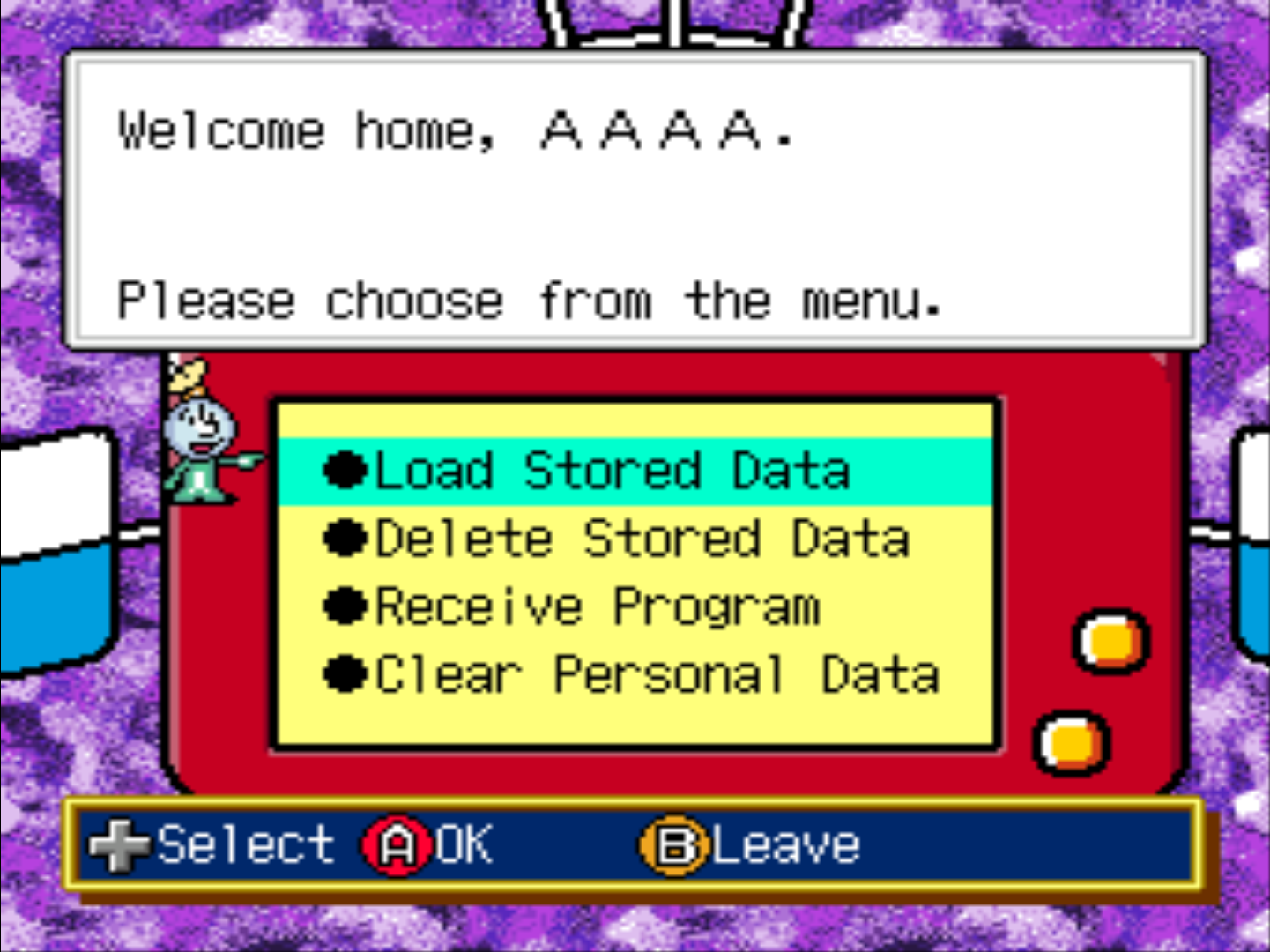 Load Stored Data: play the game you started at the beginningDelete Stored Data: delete the contents of the gameReceive Program: receive an update (can no longer function)Clear Personal Data: delete the profile you have created so far